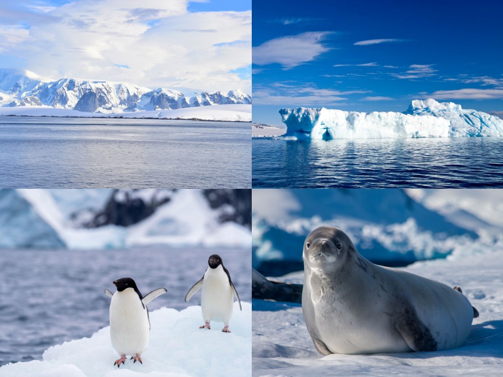 壯麗的冰山如雕塑般矗立海面,在陽光折射下閃耀著夢幻的藍白光芒;遠方連綿的雪峰與冰川構築出宛如史詩般的極地景觀。成群的企鵝在岸邊嬉戲穿梭,海豹悠然棲息於浮冰之上,偶爾可見鯨魚劃破海面,為這片靜謐天地增添生命的律動。